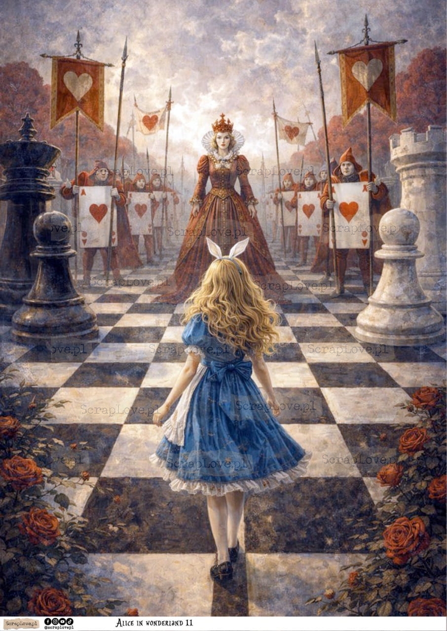 ALICE, ALICJA, ALICE IN WONDERLAND, ALICJA W KRAINIE CZARÓW, KRAINA CZARÓW, KARTY, FANTAZJA, BAJKA, KSIĄŻKA, NAPISY, CYTATY, DECOUPAGE, PAPIER RYŻOWY, RICE PAPER, WYDRUK NA PAPIERZE, PAPER PRINT, 250G, VELIUM PAPER, KALKA, WYDRUK NA KALCE