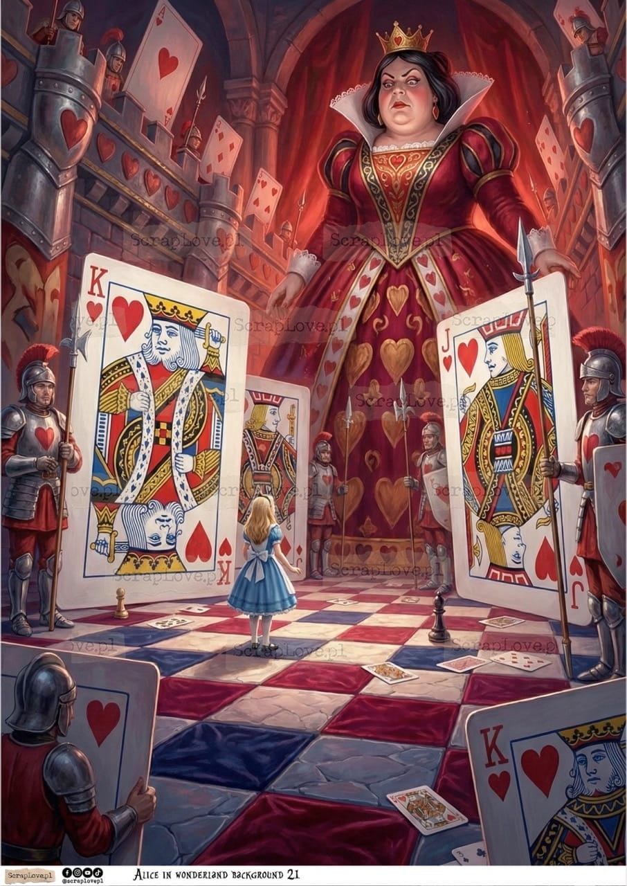ALICE, ALICJA, ALICE IN WONDERLAND, ALICJA W KRAINIE CZARÓW, KRAINA CZARÓW, KARTY, FANTAZJA, BAJKA, KSIĄŻKA, NAPISY, CYTATY, DECOUPAGE, PAPIER RYŻOWY, RICE PAPER, WYDRUK NA PAPIERZE, PAPER PRINT, 250G, VELIUM PAPER, KALKA, WYDRUK NA KALCE