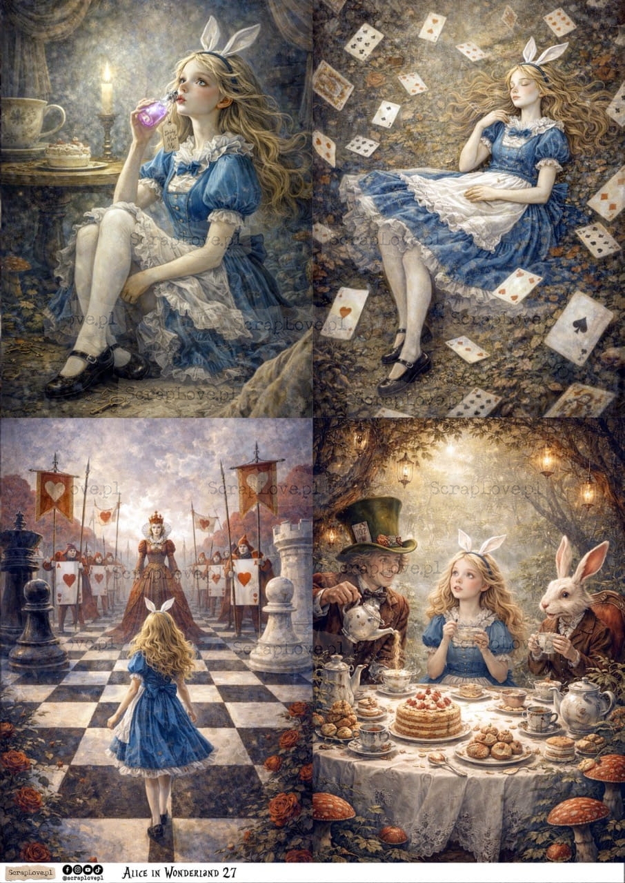 ALICE, ALICJA, ALICE IN WONDERLAND, ALICJA W KRAINIE CZARÓW, KRAINA CZARÓW, KARTY, FANTAZJA, BAJKA, KSIĄŻKA, NAPISY, CYTATY, DECOUPAGE, PAPIER RYŻOWY, RICE PAPER, WYDRUK NA PAPIERZE, PAPER PRINT, 250G, VELIUM PAPER, KALKA, WYDRUK NA KALCE