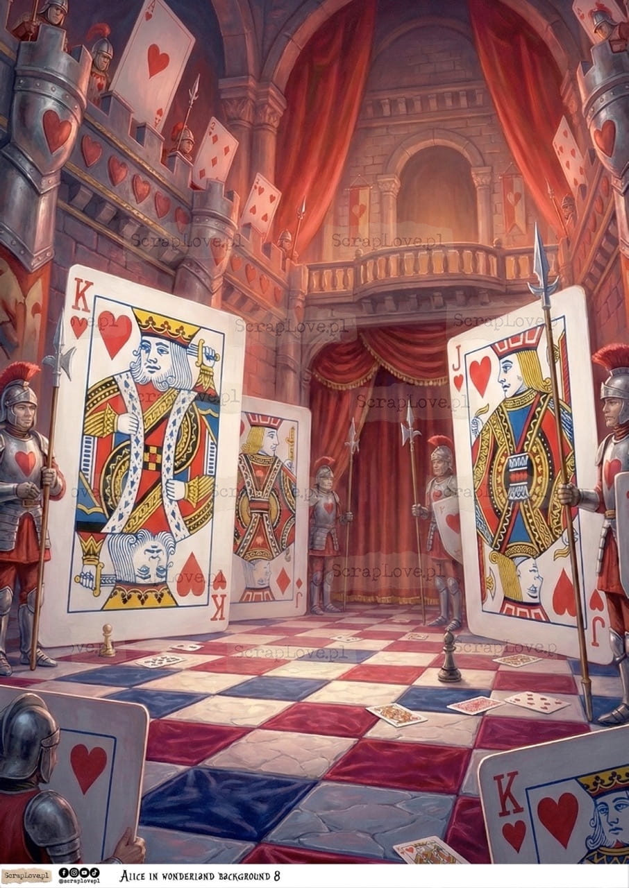 ALICE, ALICJA, ALICE IN WONDERLAND, ALICJA W KRAINIE CZARÓW, KRAINA CZARÓW, KARTY, FANTAZJA, BAJKA, KSIĄŻKA, NAPISY, CYTATY, DECOUPAGE, PAPIER RYŻOWY, RICE PAPER, WYDRUK NA PAPIERZE, PAPER PRINT, 250G, VELIUM PAPER, KALKA, WYDRUK NA KALCE