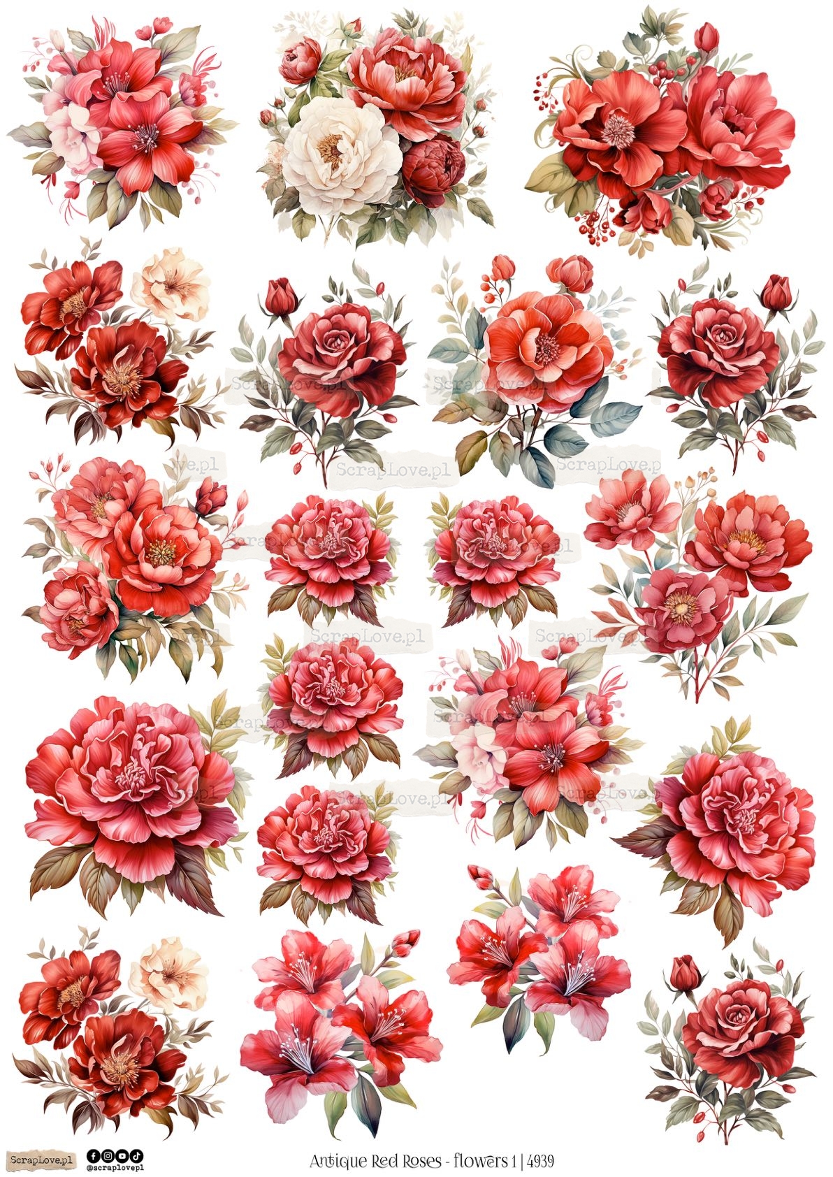 ANTIQUE RED ROSES FLOWERS 1 - 4939 - DRUK NA PAPIERZE