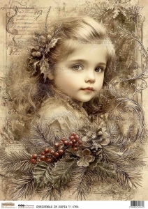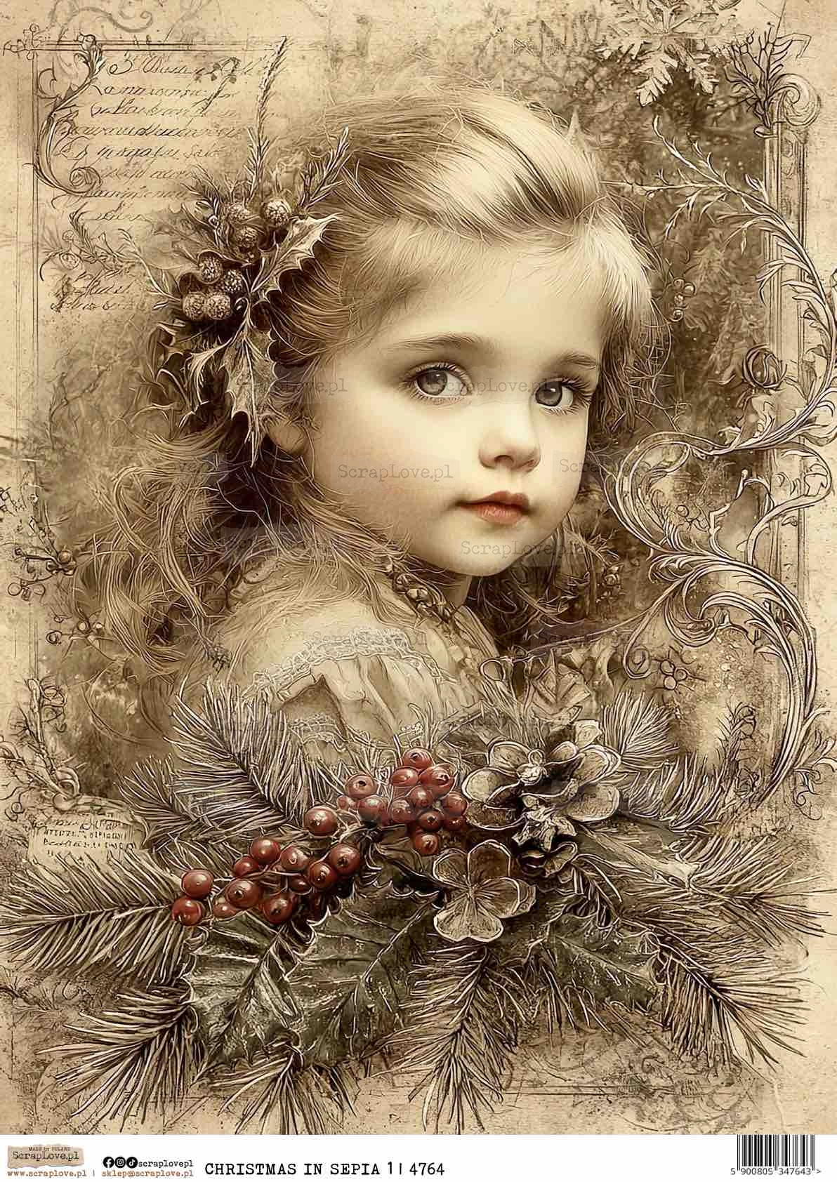 boże narodzenie, Christmas, święta, holidays, dziewczynka retro, vintage girl, sepia, sepia tone, świąteczna ilustracja, Christmas illustration, klasyczny styl, classic style, vintage Christmas, retro, shabby chic, nostalgiczna ilustracja, nostalgic illustration, elegancka sztuka, elegant art, portret dziecka, child portrait, zimowy klimat, winter atmosphere, szyszki, pinecones, ostrokrzew, holly, czerwone jagody, red berries, gałązki świerkowe, fir branches, delikatny rysunek, delicate drawing, świąteczny klimat, festive mood, bożonarodzeniowy motyw, Christmas motif, magiczna zima, magical winter, cozy Christmas, tradycyjny styl, traditional style, artystyczna ilustracja, artistic illustration, świąteczne papiery, Christmas papers, scrapbooking, cardmakingg