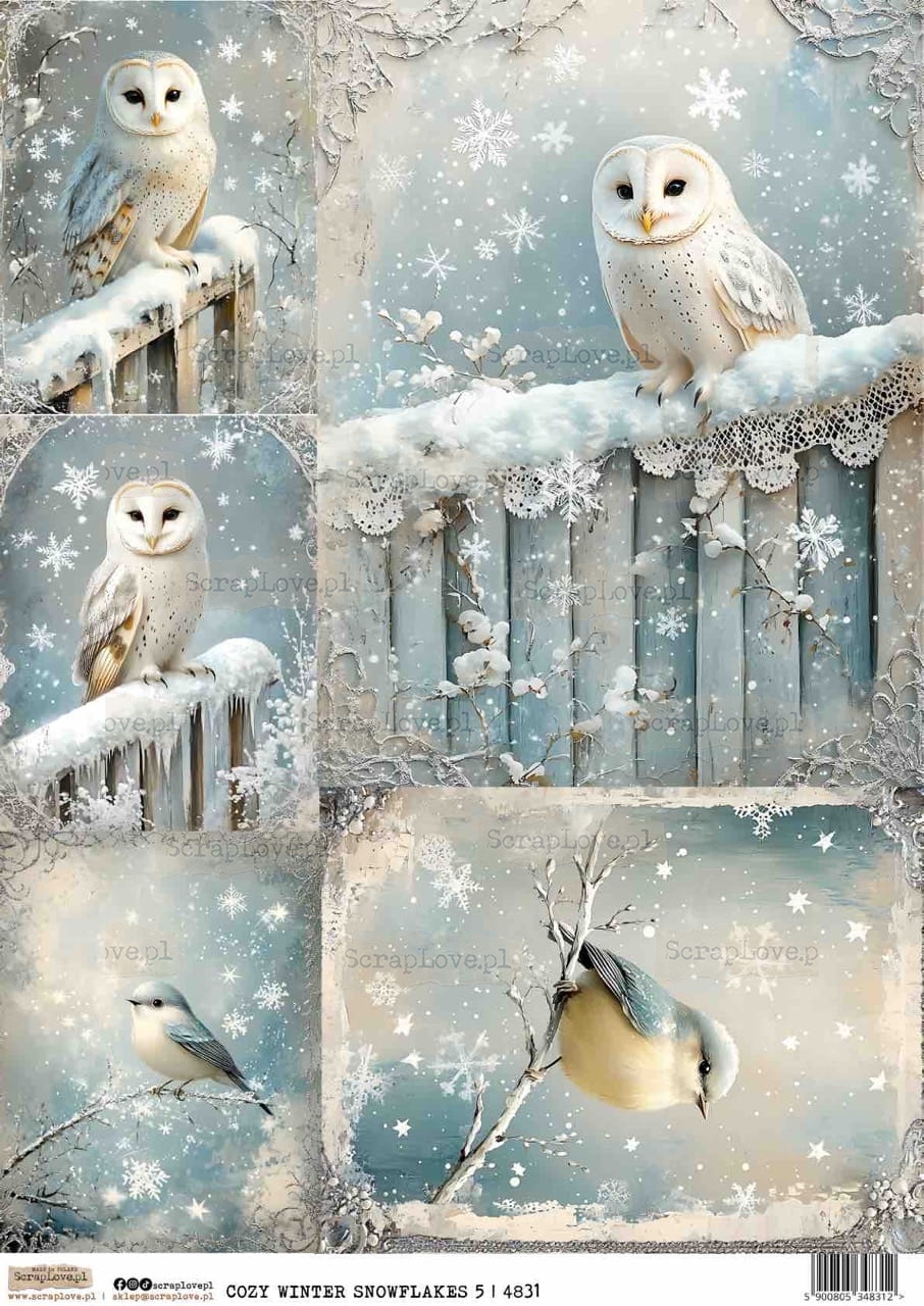 cozy winter, snowflakes, winter birds, owl, barn owl, titmouse, snow scene, frosty forest, winter nature, soft winter, vintage Christmas, shabby chic, rustic winter, snowy branches, cozy design, winter serenity, watercolor winter, winter wonderland, ethereal art, peaceful winter, frosty decor, winter nostalgia, handmade crafts, scrapbook paper, cardmaking, winter art, cold beauty, winter forest, snowy animals, delicate winter, gentle tones, hygge Christmas