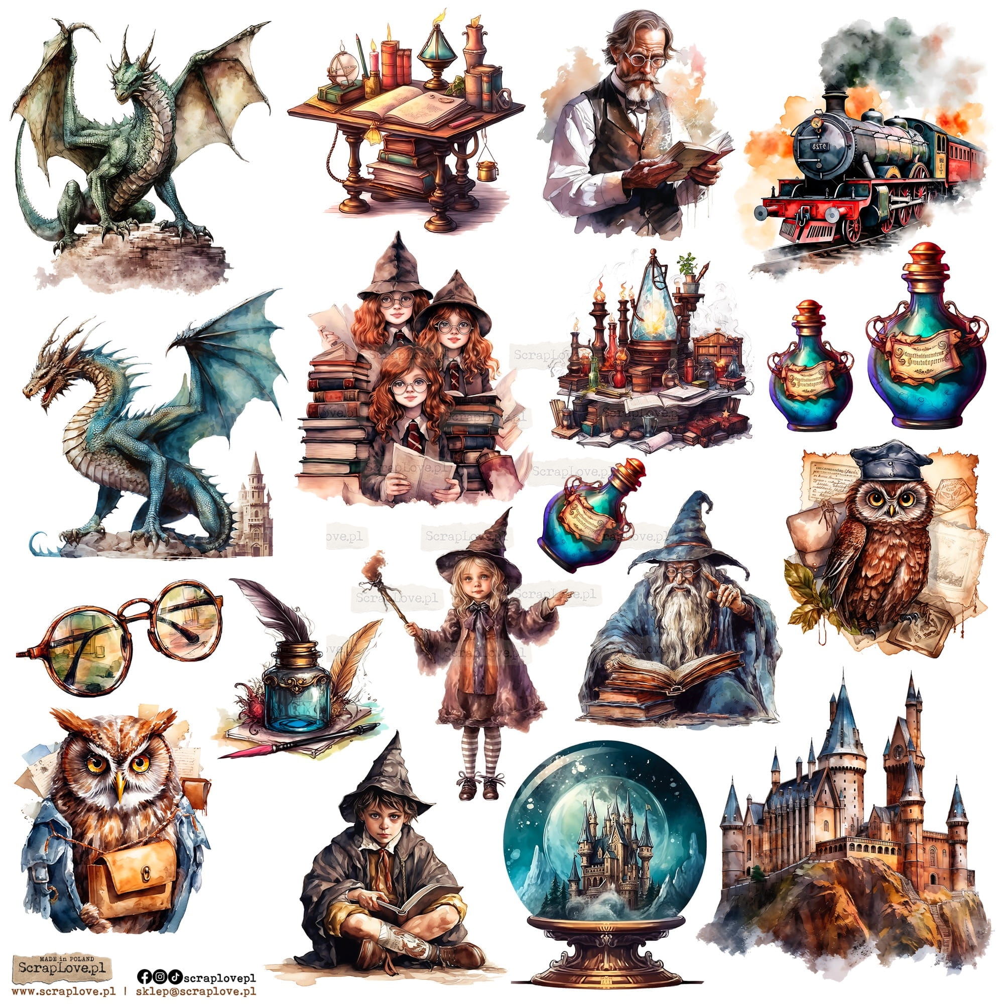 Zestaw elementów samoprzylepnych na arkuszu 24x24cm w wersji na papierze lub na przezroczystej folii.