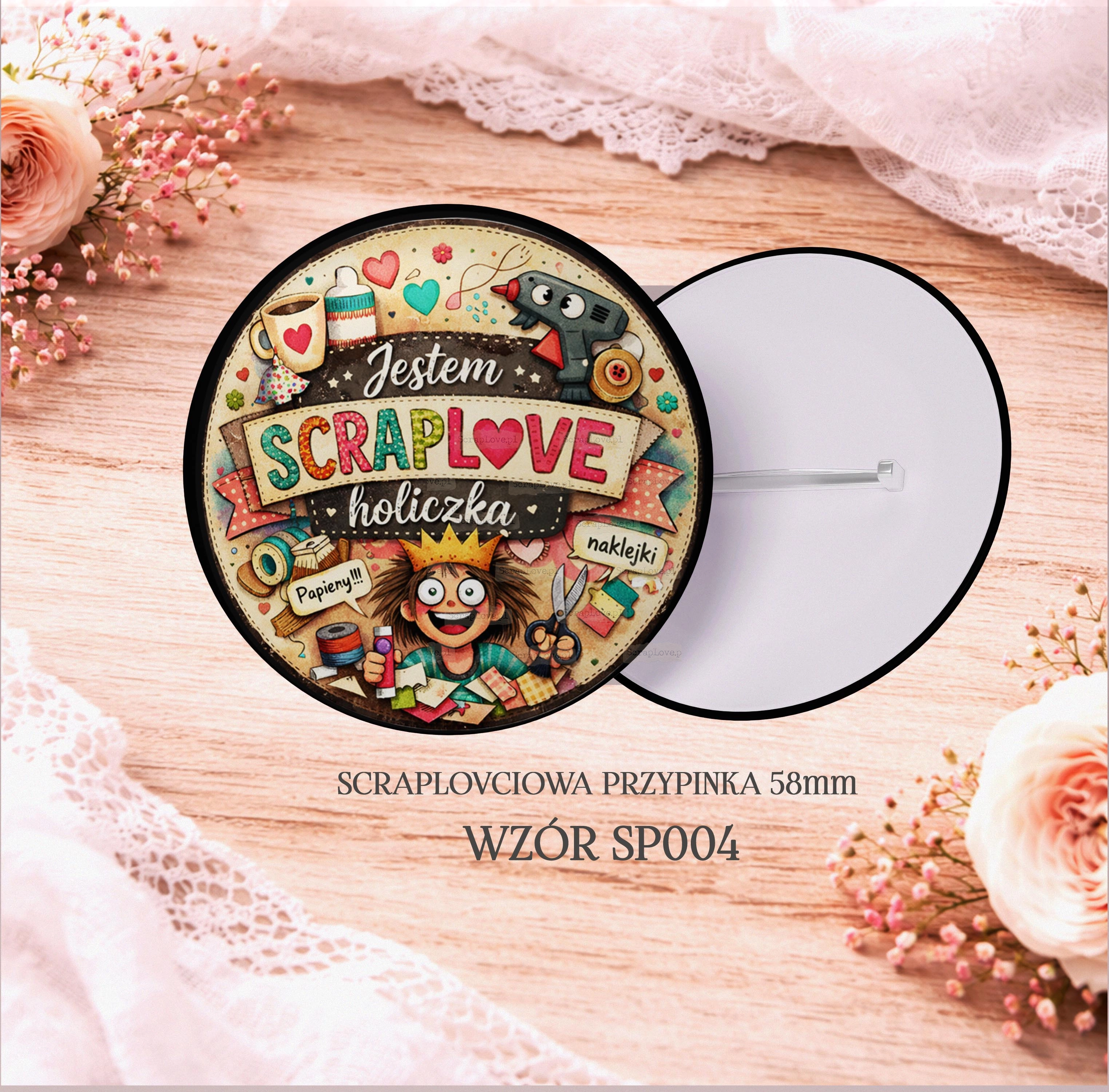 przypinka, button, ozdoba, scraplove, agrafka, button, badzik, badge