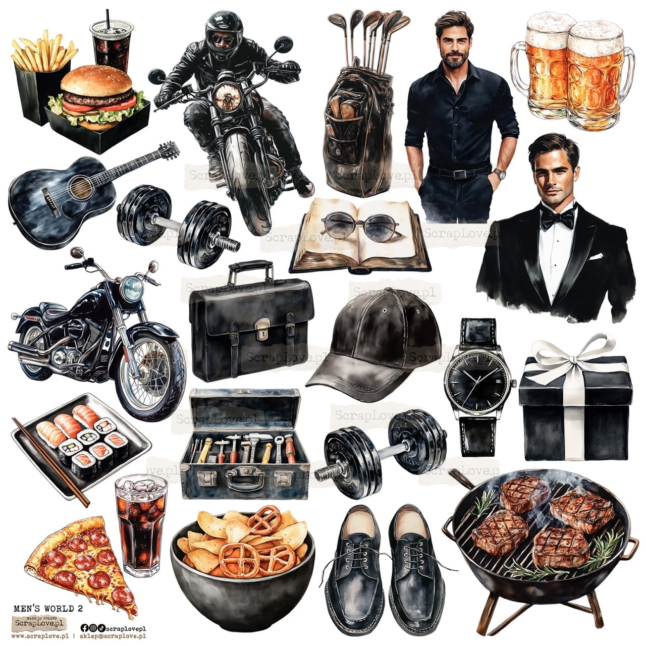 MEN, MĘŻCZYŹNI, MĘSKIE, MAN, MĘŻCZYZNA, MOTORCYCLE, MOTOCYKL, BIKER, GUITAR, GITARA, DUMBBELLS, HANTLE, GOLF, BEER, PIWO, WATCH, ZEGAREK, BRIEFCASE, TECZKA, SUNGLASSES, OKULARY, TOOLS, NARZĘDZIA, GRILL, STEAK, STEK, SUSHI, PIZZA, FOOD, JEDZENIE, SHOES, BUTY