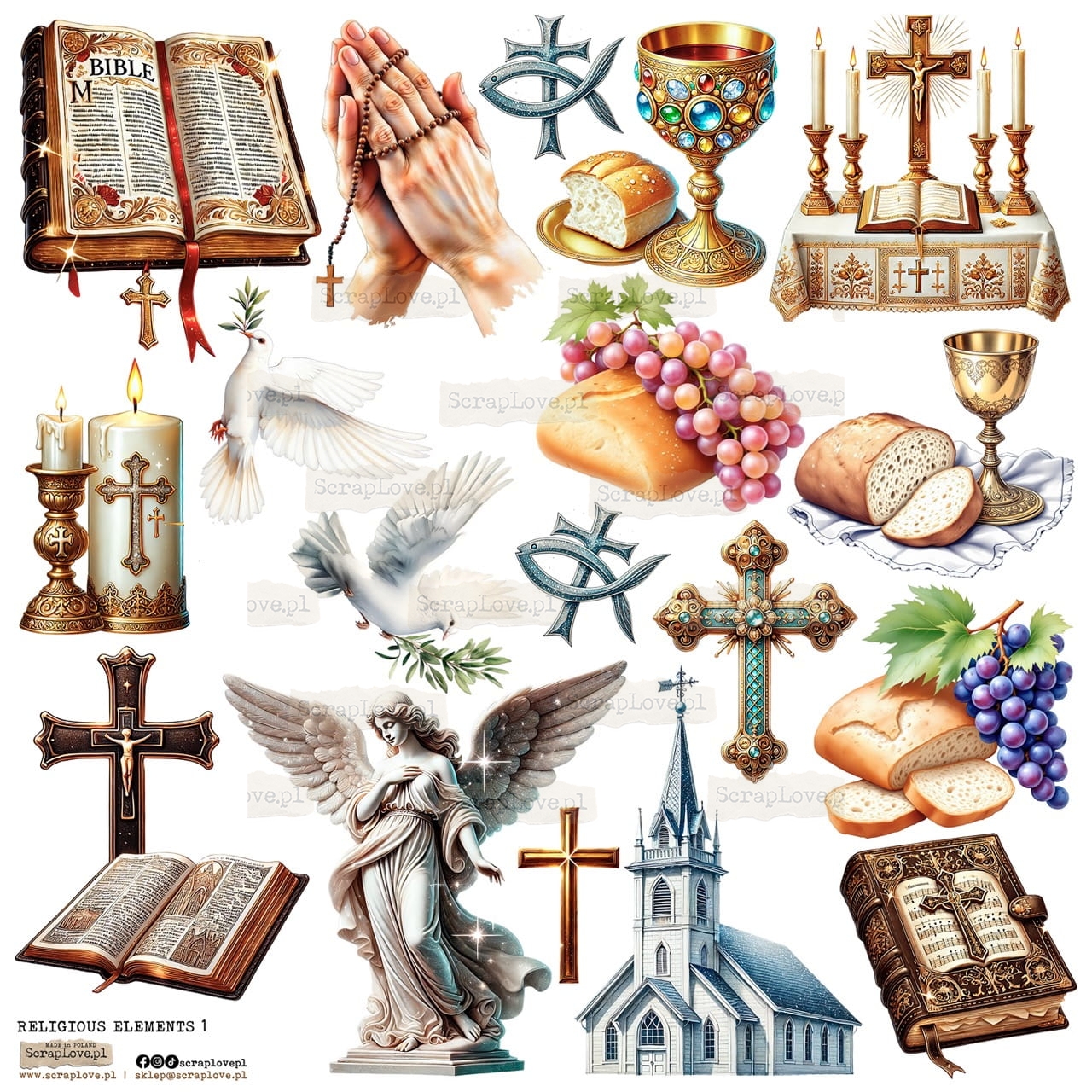RELIGIJNE, RELIGIOUS, ELEMENTS, ELEMENTY, BIBLE, BIBLIA, ROSARY, ROSARIES, RÓŻAŃCE, RÓŻANIEC, KRZYŻ, CROSS, KRZYŻE, CROSSES, HOLY, MARY, MARYJA, ANGELS, ANIOŁY, ANIOŁKI, ANGEL, ŚWIECE, ŚWIECA, CANDLE, CANDLES, CHURCH, KOŚCIÓŁ, BREAD, CHLEB, WINO, WINE, GOŁĘBIE, DOVES, GOŁĄB, DOVE