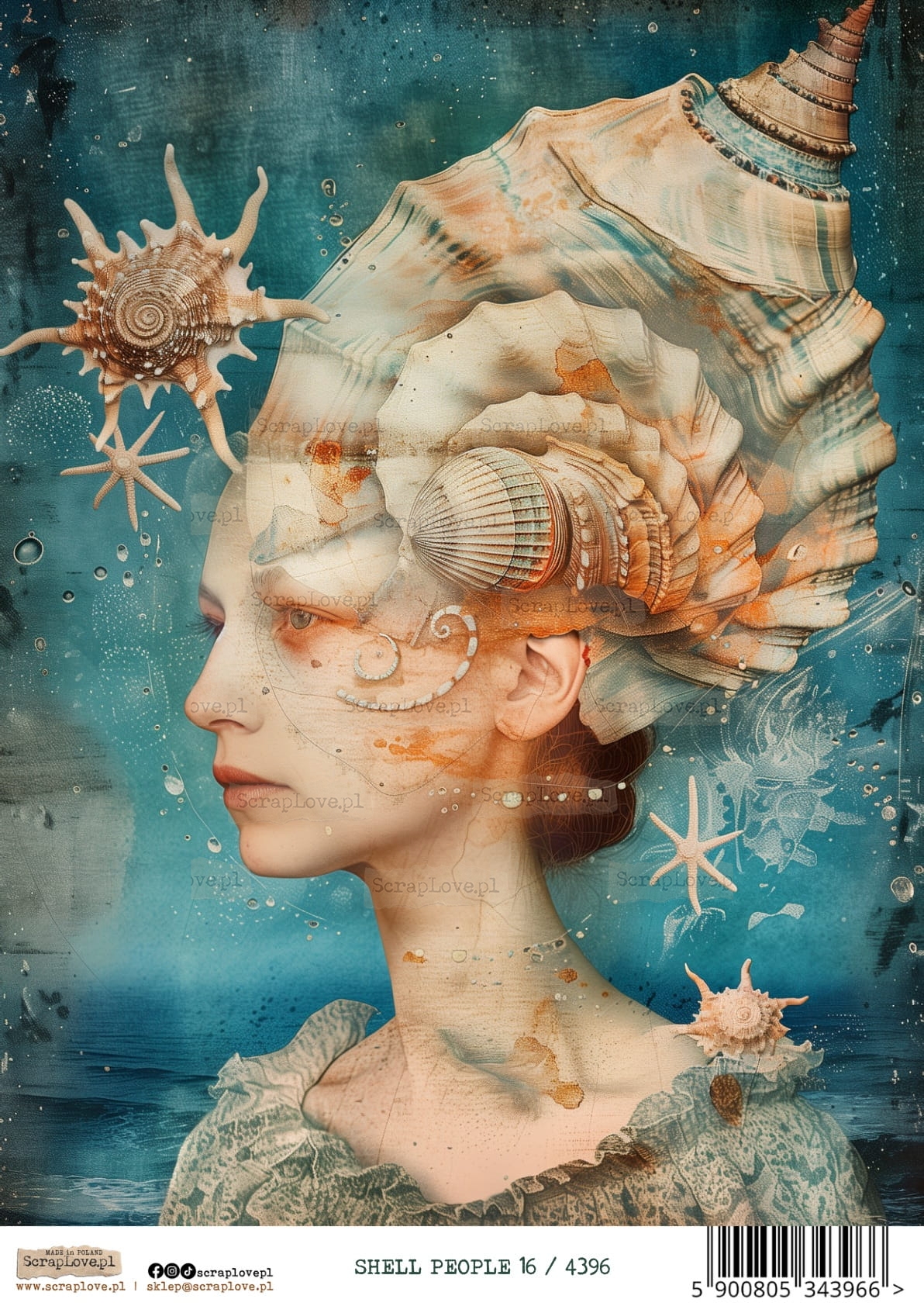 Muszla, Kobieta, Portret, Surrealizm, Morze, Ocean, Styl vintage, Kolory pastelowe, Fantazja, Natura, Morska istota, Rysunek, Ilustracja, Biżuteria z muszli, Styl renesansowy, Baśniowy świat, surrealizm, shell people, OCEAN, KOBIETA MUSZLA, MORSKIE, PODWODNY ŚWIAT