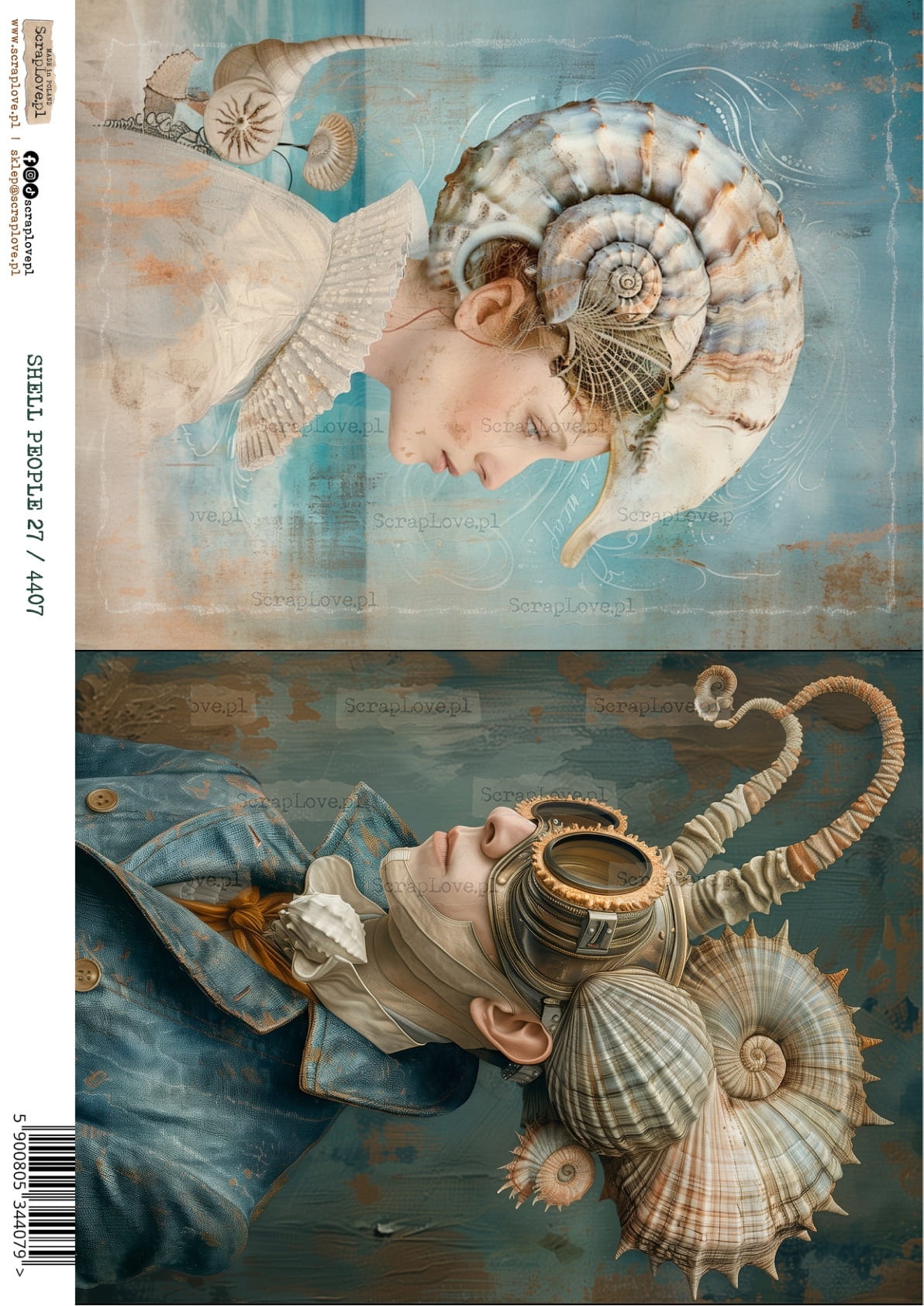 Muszla, Kobieta, Portret, Surrealizm, Morze, Ocean, Styl vintage, Kolory pastelowe, Fantazja, Natura, Morska istota, Rysunek, Ilustracja, Biżuteria z muszli, Styl renesansowy, Baśniowy świat, surrealizm, shell people, OCEAN, KOBIETA MUSZLA, MORSKIE, PODWODNY ŚWIAT