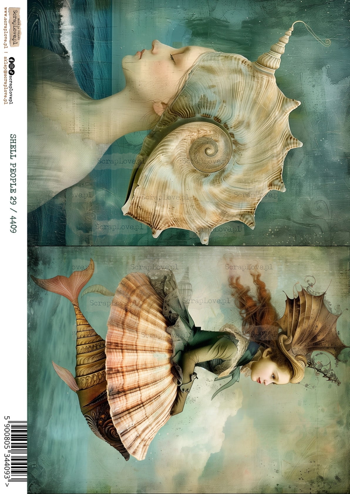Muszla, Kobieta, Portret, Surrealizm, Morze, Ocean, Styl vintage, Kolory pastelowe, Fantazja, Natura, Morska istota, Rysunek, Ilustracja, Biżuteria z muszli, Styl renesansowy, Baśniowy świat, surrealizm, shell people, OCEAN, KOBIETA MUSZLA, MORSKIE, PODWODNY ŚWIAT