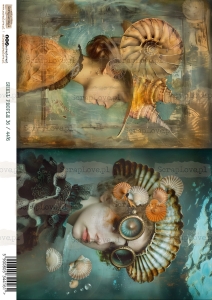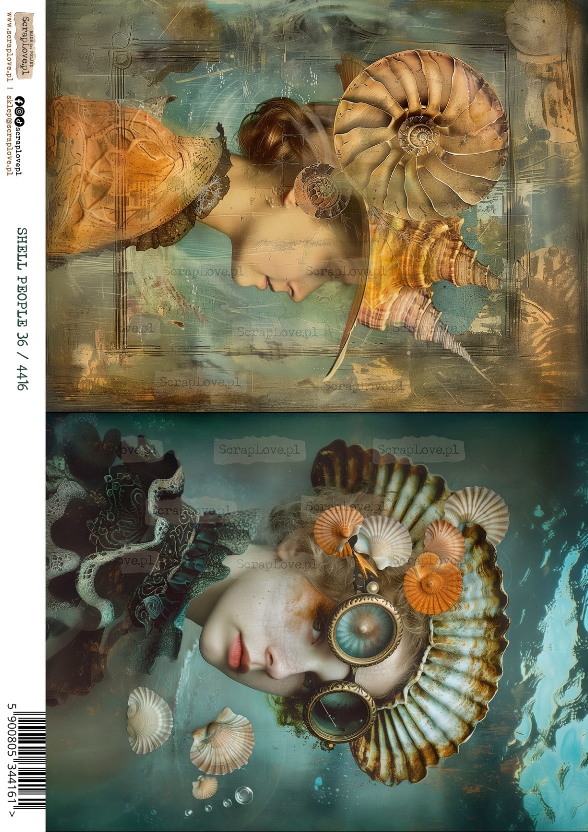 Muszla, Kobieta, Portret, Surrealizm, Morze, Ocean, Styl vintage, Kolory pastelowe, Fantazja, Natura, Morska istota, Rysunek, Ilustracja, Biżuteria z muszli, Styl renesansowy, Baśniowy świat, surrealizm, shell people, OCEAN, KOBIETA MUSZLA, MORSKIE, PODWODNY ŚWIAT