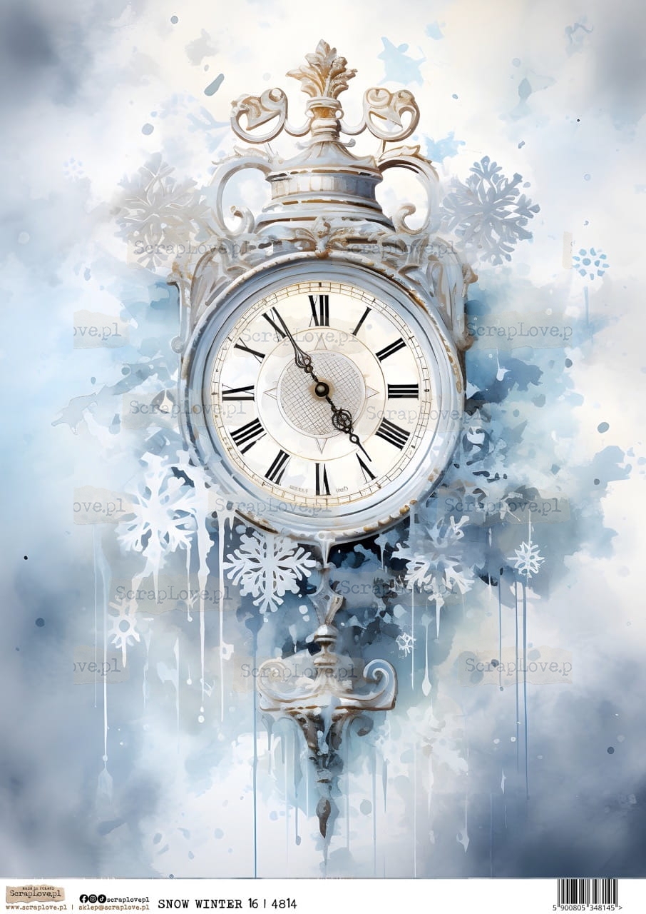 winter clock, snowy clock, vintage clock, new year, winter time, snowy background, elegant winter, winter decor, frost, snowflakes, blue tones, winter vintage, snowy art, Christmas clock, New Year’s Eve, holiday time, winter wonderland, pastel winter, watercolor background, akwarela, time passing, antique clock, steampunk winter, cold elegance, magical winter, frosty charm, serene winter, winter art, artistic background, handmade crafts, scrapbooking, cardmaking, festive design