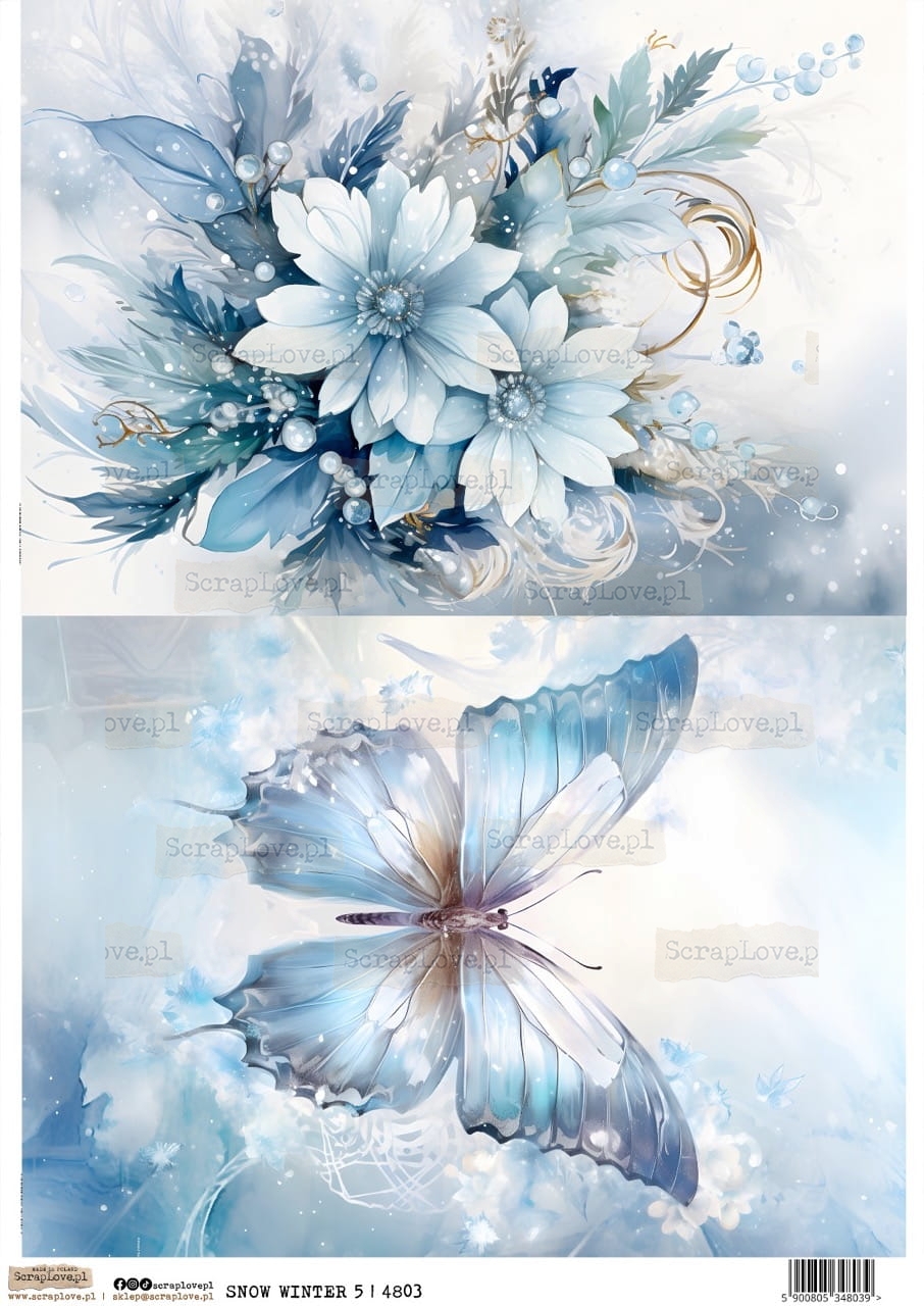 zimowe kwiaty, winter flowers, zimowy motyl, winter butterfly, błękitny motyl, blue butterfly, kwiaty w śniegu, flowers in snow, zimowa elegancja, winter elegance, akwarela, watercolor, artystyczna ilustracja, artistic illustration, zimowy pejzaż, winter scene, magiczna zima, magical winter, pastelowe kolory, pastel colors, boże narodzenie, Christmas, święta, holidays, shabby chic, vintage winter, nordycki styl, Nordic style, błękitna zima, blue winter, delikatny styl, delicate style, romantyczna zima, romantic winter, frost, icy art, świąteczne papiery, Christmas papers, scrapbooking, cardmaking, tło zimowe, winter background, floral design, flower bouquet, snow fantasy, winter fairy tale, artistic winter, butterfly art