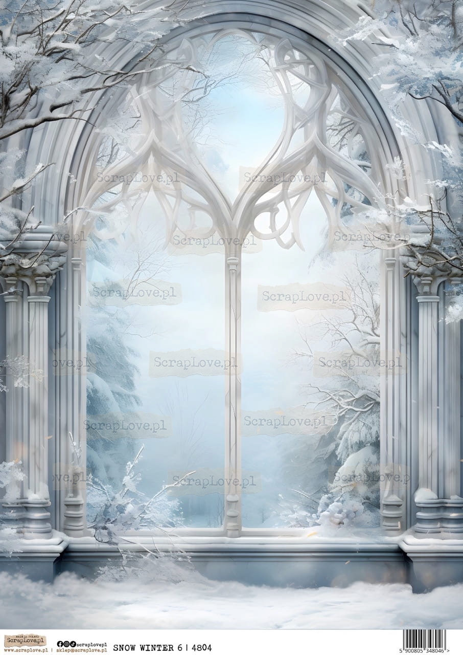 zimowe okno, winter window, gotyckie okno, gothic window, zimowy pejzaż, winter landscape, śnieg, snow, magiczna zima, magical winter, frost, icy palace, pałac z lodu, ice palace, fantasy, fairytale, baśniowy klimat, fairytale mood, błękitna zima, blue winter, nordycki styl, Nordic style, elegancka zima, elegant winter, rustykalny styl, rustic style, pastelowe kolory, pastel colors, świąteczne papiery, Christmas papers, scrapbooking, cardmaking, tło zimowe, winter background, artystyczna ilustracja, artistic illustration, boże narodzenie, Christmas, święta, holidays, frost window, frozen design, winter fairytale, winter castle, ethereal art, serene landscape, snowy decor, winter fantasy