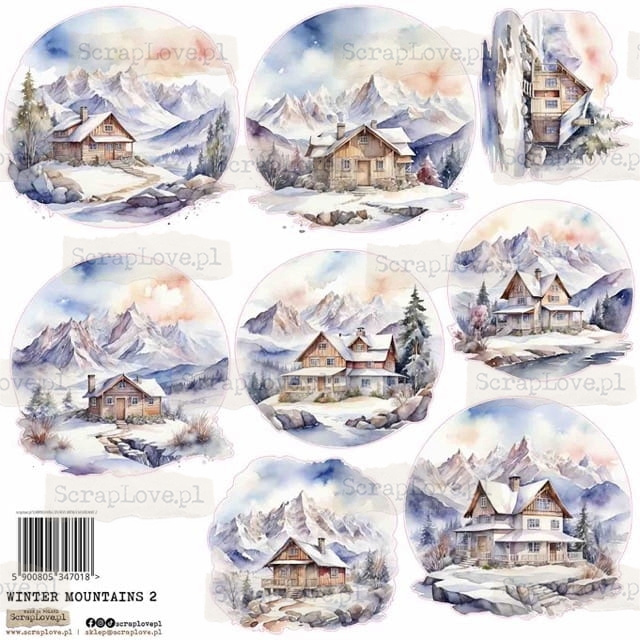 zimowe góry, winter mountains, zimowy pejzaż, winter landscape, górska chata, mountain cabin, śnieg, snow, szyszki, pinecones, wianek świąteczny, Christmas wreath, gałązki świerkowe, fir branches, las zimą, winter forest, góry, mountains, akwarela, watercolor, ilustracja, illustration, bożonarodzeniowy klimat, Christmas atmosphere, świąteczna sceneria, festive scenery, zimowy nastrój, winter mood, przytulna chata, cozy cabin, ośnieżone góry, snowy mountains, zimowa przyroda, winter nature, vintage winter, tradycyjna ilustracja, traditional illustration, kartka świąteczna, Christmas card, górski krajobraz, mountain scenery, malownicza zima, picturesque winter